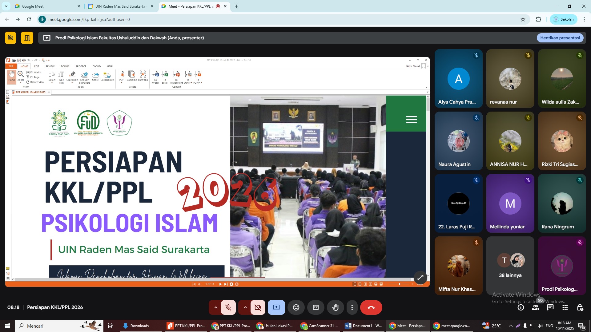 Sukoharjo, Jumat, 11 Oktober 2025. Program Studi Psikologi Islam, Fakultas Ushuluddin dan Dakwah (FUD) UIN Raden Mas Said Surakarta, menggelar kegiatan Sosialisasi Persiapan Kuliah Kerja Lapangan (KKL) dan Praktik Pengalaman Lapangan (PPL) Tahun 2026. Kegiatan ini dilaksanakan secara online dan diikuti oleh mahasiswa angkatan 2023, serta dihadiri oleh Ketua Jurusan Psikologi dan Psikoterapi, Koordinator Program Studi Psikologi Islam, dan para dosen Psikologi Islam. KKL dan PPL merupakan mata kuliah wajib dengan kode FUD 401 dan bobot 3 SKS yang harus diikuti oleh seluruh mahasiswa Program Studi Psikologi Islam. Kegiatan sosialisasi ini bertujuan memberikan pemahaman komprehensif kepada mahasiswa mengenai pelaksanaan KKL dan PPL yang akan dijalankan pada Semester Genap tahun 2026 mendatang. Melalui kegiatan ini, mahasiswa dibekali informasi terkait tujuan, mekanisme, serta tata laksana kegiatan yang menjadi bagian penting dari proses akademik di Program Studi Psikologi Islam.