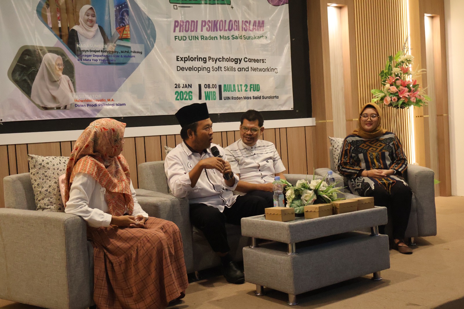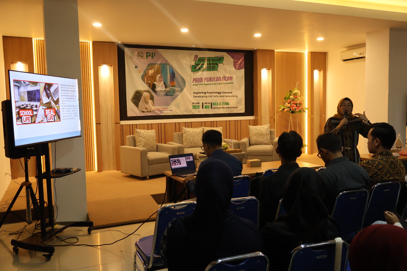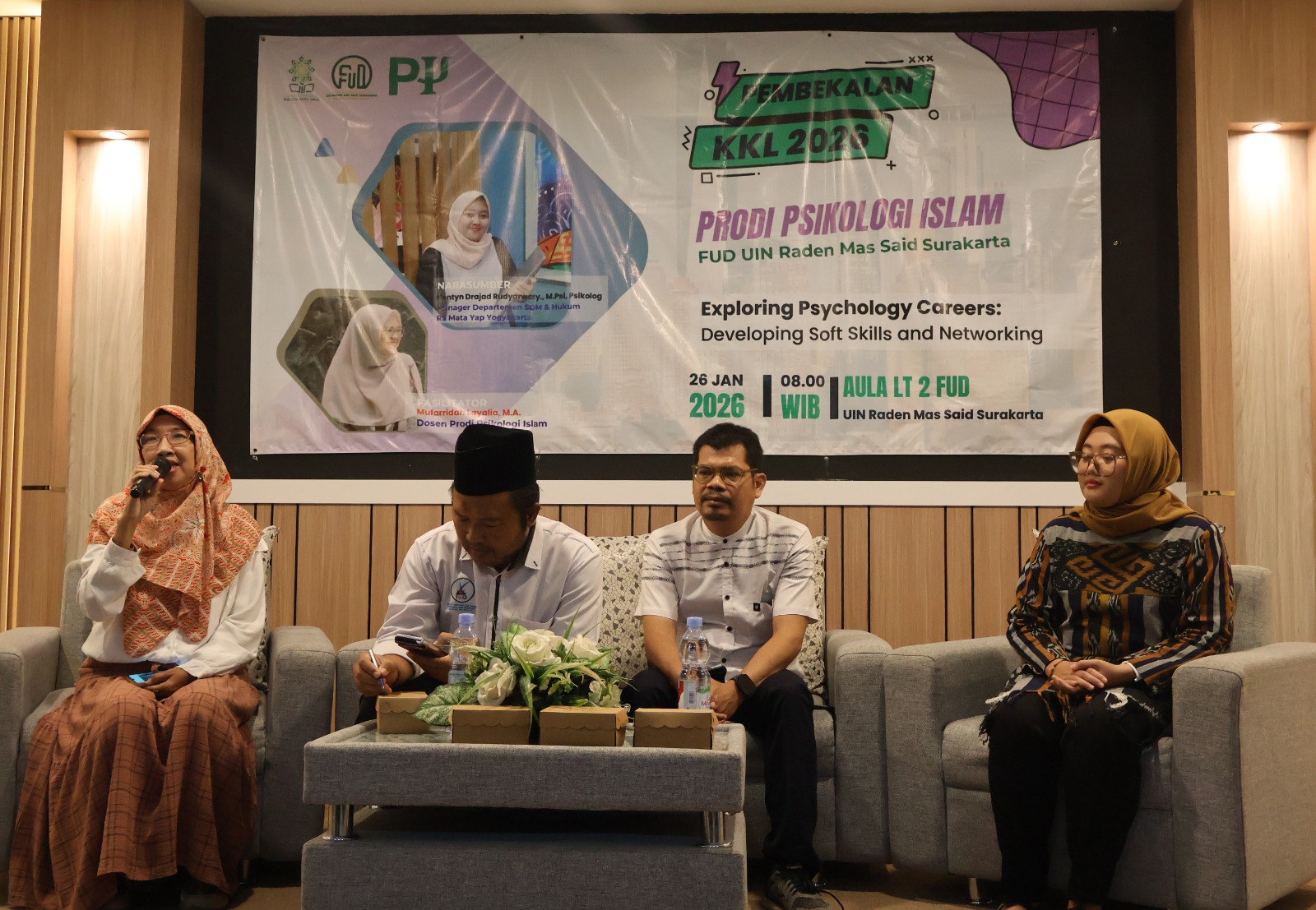 Sukoharjo, Senin 26 Januari 2026. Program Studi Psikologi Islam, Fakultas Ushuluddin dan Dakwah (FUD), UIN Raden Mas Said Surakarta menyelenggarakan kegiatan Pembekalan Kuliah Kerja Lapangan (KKL) Tahun 2026. Kegiatan yang berlangsung di Aula Lantai 2 Gedung FUD ini diikuti oleh mahasiswa semester VI sebagai bagian dari persiapan strategis sebelum terjun langsung ke dunia profesional dan instansi mitra. Kegiatan pembekalan ini dihadiri oleh pimpinan fakultas dan jurusan, dosen, narasumber, serta seluruh mahasiswa peserta KKL. Hadir pula Dekan Fakultas Ushuluddin dan Dakwah UIN Raden Mas Said Surakarta beserta jajaran pimpinan, Ketua Jurusan Psikologi dan Psikoterapi, Koordinator Program Studi Psikologi Islam, para Dosen Pembimbing Lapangan, serta narasumber pembekalan.